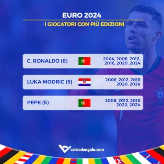 Subito dietro in questa speciale classifica ci sono Luka Modric e Pepe, due giocatori che CR7 conosce molto bene. Entrambi sono a quota 5 con questa edizione, con l’unica differenza che il centrocampista della Croazia – sua compagno per tanti anni al Real Madrid – ha raggiunto il 5^ europeo qualche giorno fa nella terribile sconfitta alla 1^ giornata contro la Spagna; il difensore invece gioca nella sua stessa nazionale, quindi raggiungerà quota 5 fasi finali degli Europei disputate solo questa sera.