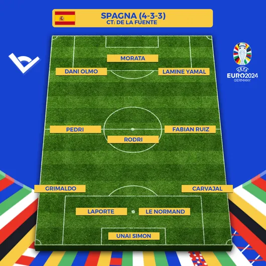 Formazione tipo Spagna (4-3-3): Unai Simon; Carvajal, Le Normand, Laporte, Grimaldo; Rodri, Zubimendi, Fabian Ruiz; Yamal, Morata, Dani Olmo. All. De La Fuente