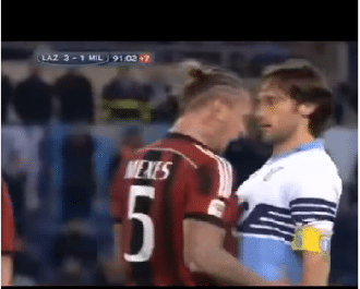Ognuno di noi ha un amico che non sa perdere. Se lo stesso amico presenta la tendenza ad essere irascibile e poco tollerante meglio non stuzzicarlo troppo. Se quell’amico è Mexes potrebbe succedere quello che accadde a Mauri sul risultato di 3-1 durante un Lazio-Milan. I due vengono a contatto per un fallo del difensore proprio sull’ex capitano della Lazio, che stizzito gli rifila un calcetto. Il francese perde completamente la testa tanto che una volta ripreso regolarmente il gioco va a cercare Mauri e gli mette le mani addosso. L’arbitro Mazzoleni sventola il rosso, ma Mexes non ancora soddisfatto torna a contatto con il centrocampista della Lazio e non troppo amichevolmente lo abbranca con una presa al collo degna di un campione WWE. Ci vorrà l’intervento di praticamente tutti i calciatori di entrambe le squadre per far guadagnare a Mexes la via degli spogliatoi.