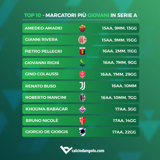 Il secondo, per quanto più difficile da battere, sarebbe ancora più speciale. Come vi avevamo già spiegato nel suo pezzo di presentazione (qui per scoprire la storia di Francesco Camarda), con la maglia delle giovanili del Milan Camarda ha già messo a segno più di 500 reti. Ad appena 15 anni. Si tratta di un prospetto decisamente interessante per il futuro, non solo dei rossoneri, ma del calcio italiano in generale. Se – oltre ad esordire – contro la Fiorentina riuscisse anche a segnare, diventerebbe il marcatore più giovane nella storia della Serie A. In vista del possibile record storico, vediamo quali sono i dieci marcatori più giovani nella storia del massimo campionato italiano.