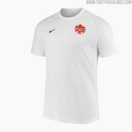 Molto simile alla prima anche la seconda maglia del Canada, per la quale si è optato per il bianco come colore predominante. Anche in questo caso il logo Nike, stavolta di colore nero, è posto alla sinistra del simbolo della Nazionale canadese, che così come per la prima maglia non abbandona i colori originali. Rispetto alla prima divisa, tuttavia, non si segnala alcuna rifinitura che arricchisca il tema prevalente, presentandosi perciò come una semplice maglia bianca arricchita dei simboli distintivi dello sponsor tecnico e della federazione. Il Canada, pertanto, è pronto a sfoggiare due divise semplici ma sempre originali, che rispecchiano la tradizione e le caratteristiche della propria storia nonché della propria identità nazionale.