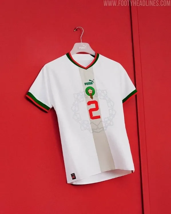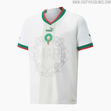 Leggermente diversa rispetto alla prima è invece la seconda maglia del Marocco, per la quale si è optato per il bianco come colore predominante. Anche in questo caso il logo dello sponsor, stavolta di colore verde, è posto al centro del petto, col simbolo della Nazionale marocchina posto, in questo caso, al di sotto di esso. Altre particolarità sono rappresentate, così come la prima maglia, dal colletto e dalla base delle maniche, dove però questa volta è presente una riga bicolore verde e rossa, e anche da un'altra riga grossa centrale, che però stavolta è verticale e di una tonalità di bianco più scura, con, sullo sfondo, un quasi impercettibile simbolo stilizzato della Nazionale. Il Marocco, pertanto, è pronto a sfoggiare due divise semplici ma sempre particolari, che rispecchino la tradizione e le caratteristiche della propria storia e della propria identità nazionale.