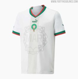 Leggermente diversa rispetto alla prima è invece la seconda maglia del Marocco, per la quale si è optato per il bianco come colore predominante. Anche in questo caso il logo dello sponsor, stavolta di colore verde, è posto al centro del petto, col simbolo della Nazionale marocchina posto, in questo caso, al di sotto di esso. Altre particolarità sono rappresentate, così come la prima maglia, dal colletto e dalla base delle maniche, dove però questa volta è presente una riga bicolore verde e rossa, e anche da un’altra riga grossa centrale, che però stavolta è verticale e di una tonalità di bianco più scura, con, sullo sfondo, un quasi impercettibile simbolo stilizzato della Nazionale. Il Marocco, pertanto, è pronto a sfoggiare due divise semplici ma sempre particolari, che rispecchino la tradizione e le caratteristiche della propria storia e della propria identità nazionale.
