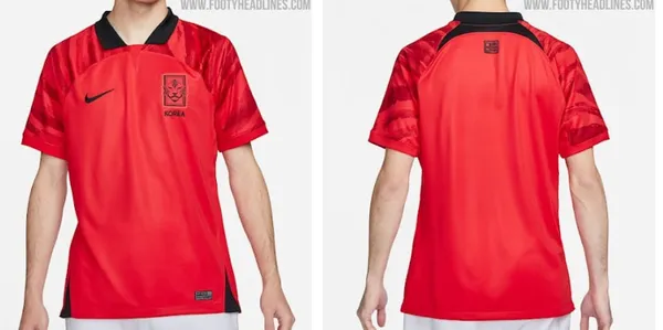 Da sempre il colore predominante nelle prime divise della Corea del Sud è il rosso, che di anno in anno ha assunto diverse gradazioni, accompagnato dalle rifiniture variabili tra il nero e il bianco e anche il blu, con quest'ultimo che contraddistingue il simbolo della Nazionale, raffigurante una tigre bianca. Una serie di colori, quindi, che richiama quelli della bandiera nazionale. Anche quest'anno non ci saranno eccezioni, con Nike che ha cercato di rispettare la tradizione apportando le dovute variazioni per rendere la maglia differente rispetto a quelle precedenti. In particolare la casa di produzione americana ha confezionato una maglia a metà strada tra il rosso e l'arancione, con le maniche contraddistinte da una fantasia di strisce con diverse gradazioni della tinta succitata, a ricreare l'effetto della pelle della tigre bianca. A completamento si può notare il colletto, interamente nero così come le rifiniture sui fianchi, alla base della maglia, il logo dello stesso sponsor tecnico e anche il simbolo della Nazionale sudcoreana, stilizzato e posto alla sinistra del marchio Nike, mentre i pantaloncini saranno bianchi.