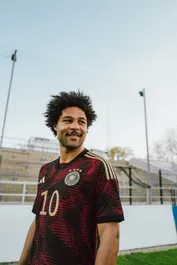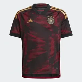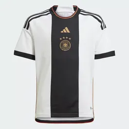 Da sempre i colori predominanti nelle divise della Germania sono il bianco e il nero, con alcuni richiami anche alle tonalità della bandiera tedesca. Anche quest'anno, per i Mondiali di Qatar 2022, la tradizione è stata rispettata, con una maglia interamente bianca attraversata da una larga riga nera centrale, nella quale vengono posti uno sotto l'altro il logo Adidas e lo stemma della Nazionale, contraddistinti dal colore dorato. Il nero va ad arricchire anche i bordi esterni delle maniche e quelli interni nella parte inferiore della maglia, nonché le classiche tre righe sulle spalle tipiche delle divise del marchio bavarese, mentre il giallo e il rosso della bandiera nazionale completano il colletto a girocollo.
