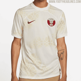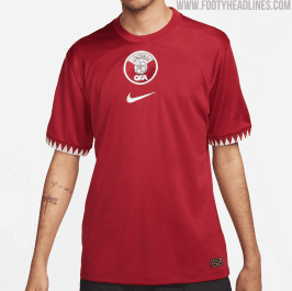 Da sempre il colore predominante nelle prime divise del Qatar è il granata, che di anno in anno ha assunto diverse gradazioni, accompagnato dalle rifiniture prevalentemente bianche, in conformità alle tonalità della bandiera nazionale. Pertanto anche per la rassegna mondiale casalinga la tradizione dovrebbe essere confermata, con le dovute variazioni rispetto al passato. In particolare Footy Headlines ha rivelato in anteprima la nuova maglia, conforme ai modelli di tutti i club vestiti da Nike ma a tinta unita, con l’unica variante costituita dai triangoli bianchi posti all’imboccatura delle maniche che richiamano proprio la bandiera qatariota. Una scelta, da parte della Nike, che si discosta molto da quella fatta per Brasile, Inghilterra, Olanda e Australia e che invece si avvicina di più al Portogallo. Inoltre il logo dello sponsor tecnico, bianco, sarà posto sotto il simbolo della Nazionale del Qatar.