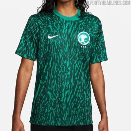 Molto simile alla prima anche la seconda maglia dell’Arabia Saudita, per la quale si è optato per il verde come colore predominante. Anche in questo caso il logo Nike, stavolta di colore bianco, è posto alla sinistra del simbolo della Nazionale araba, che così come per la prima maglia non abbandona i colori originali. Rispetto alla prima divisa, poi, il colletto resta di colore verde, ma va in contrasto con la fantasia ideata per questa divisa, caratterizzata da due diverse tonalità di questa tinta che si mischiano in tante macchie contrastanti, sia sul busto che sulle maniche. L’Arabia Saudita, pertanto, è pronto a sfoggiare due divise molto particolari e originali che tuttavia rispecchino anche la tradizione e le caratteristiche della propria storia e della propria identità nazionale.