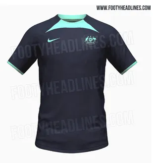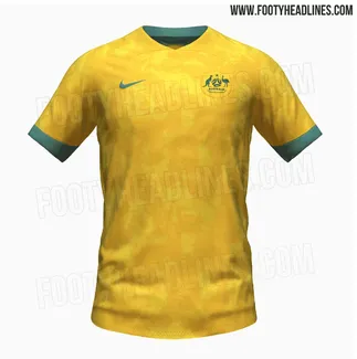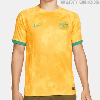 Da sempre il colore predominante nelle prime divise dell'Australia è il giallo, che di anno in anno ha assunto diverse gradazioni, accompagnato dalle rifiniture di colore verde. Pertanto anche per la rassegna mondiale di Qatar la tradizione dovrebbe essere confermata, con le dovute variazioni rispetto al passato. In particolare Footy Headlines ha rivelato in anteprima la nuova maglia, con due diverse tonalità di giallo che si mischiano creando una fantasia a macchie. Una scelta, da parte della Nike, molto vicina a quelle che hanno riguardato Brasile, Inghilterra e Olanda, anche se con modalità diverse, nonché molto contrastante con le maglie del Portogallo, finora unica eccezione tra tutte le maglie marcate dalla casa statunitense. La base delle maniche è costituita da una larga riga verde, colore che caratterizza anche il logo dello sponsor tecnico e il simbolo della Nazionale australiana, posti, come di consueto, l'uno alla sinistra dell'altro.