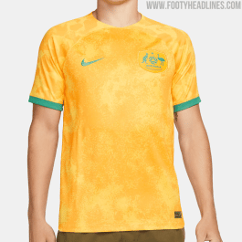 Da sempre il colore predominante nelle prime divise dell’Australia è il giallo, che di anno in anno ha assunto diverse gradazioni, accompagnato dalle rifiniture di colore verde. Pertanto anche per la rassegna mondiale di Qatar la tradizione dovrebbe essere confermata, con le dovute variazioni rispetto al passato. In particolare Footy Headlines ha rivelato in anteprima la nuova maglia, con due diverse tonalità di giallo che si mischiano creando una fantasia a macchie. Una scelta, da parte della Nike, molto vicina a quelle che hanno riguardato Brasile, Inghilterra e Olanda, anche se con modalità diverse, nonché molto contrastante con le maglie del Portogallo, finora unica eccezione tra tutte le maglie marcate dalla casa statunitense. La base delle maniche è costituita da una larga riga verde, colore che caratterizza anche il logo dello sponsor tecnico e il simbolo della Nazionale australiana, posti, come di consueto, l’uno alla sinistra dell’altro.