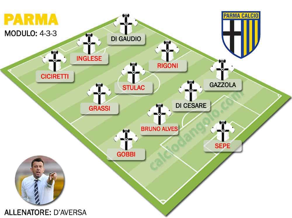 4-3-3: SEPE; Gazzola, Di Cesare, BRUNO ALVES, GOBBI; RIGONI, STULAC, GRASSI; GERVINHO, INGLESE, CICIRETTI. All. D'Aversa