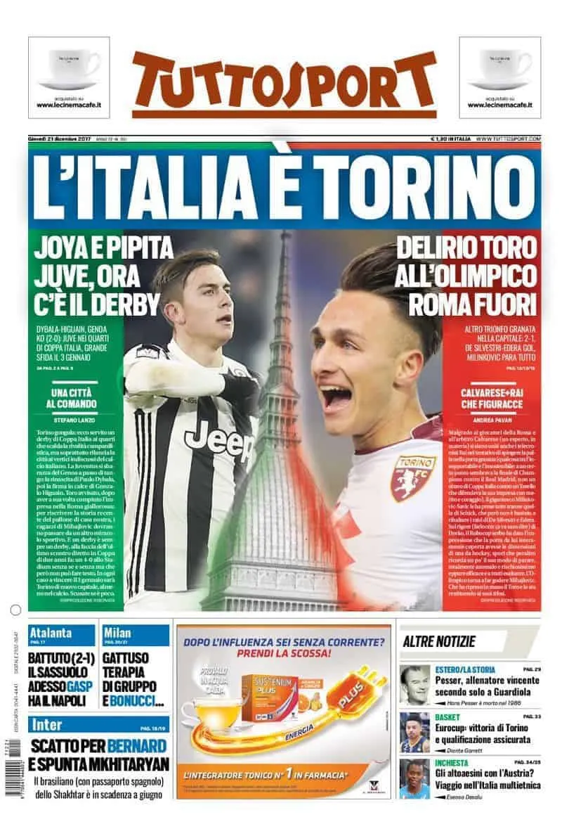 Le prime pagine dei principali quotidiani di giovedì 21 dicembre: in primo piano i match di Coppa Italia