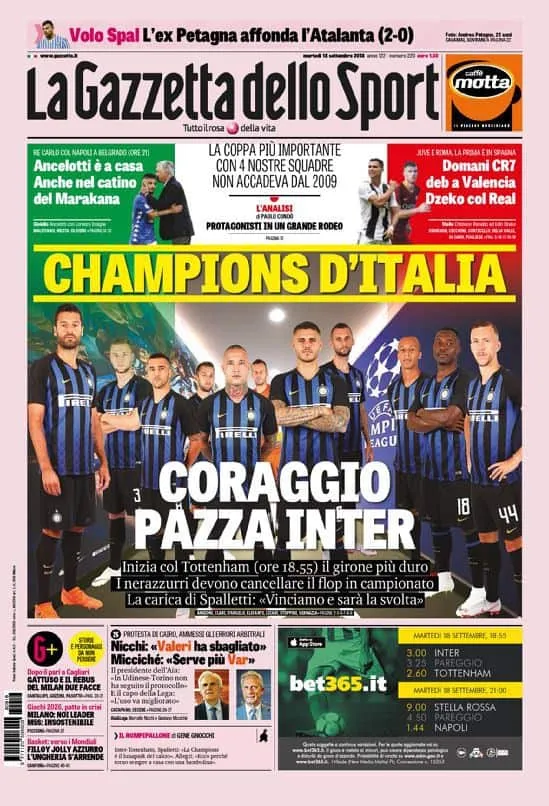Manca pochissimo all'inizio della fase a gironi di questa edizione di Champions League, e in Italia comincia già a risuonare la musichetta più famosa del mondo del calcio. Inevitabilmente, dunque, la coppa dalle grandi orecchie domina le prime pagine delle testate sportive di oggi martedì 18 settembre 2018. Apre le danze l'Inter, attesa dal difficile esordio casalingo contro il Tottenham di Pochettino ed Harry Kane. Spalletti carica i suoi: “Divertiamoci, una vittoria sarebbe la svolta”.