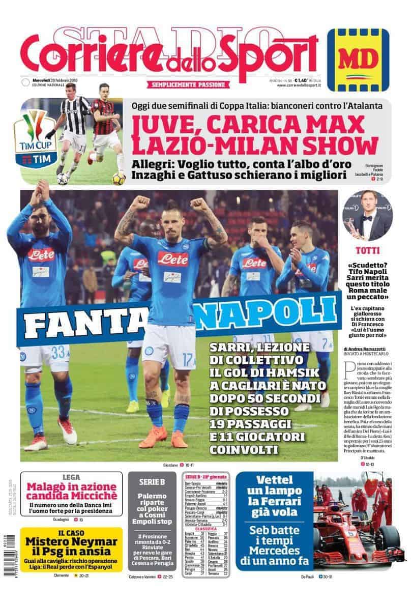 Corriere dello Sport – In primo piano, il gioco del . Anche qui, taglio alto dedicato alla Coppa Italia: Allegri vuole tutto, mentre Inzaghi e Gattuso schiereranno i migliori per il passaggio in finale. Taglio basso per le parole di Malagò che vota Micciché e per Neymar che rischia l’operazione. Infine, in Serie B, il Palermo ne rifila 4 all’ex Cosmi, mentre l’Empoli si fa raggiungere all’ultimo minuto e il Frosinone pareggia rimontando da 0-2 a 2-2.