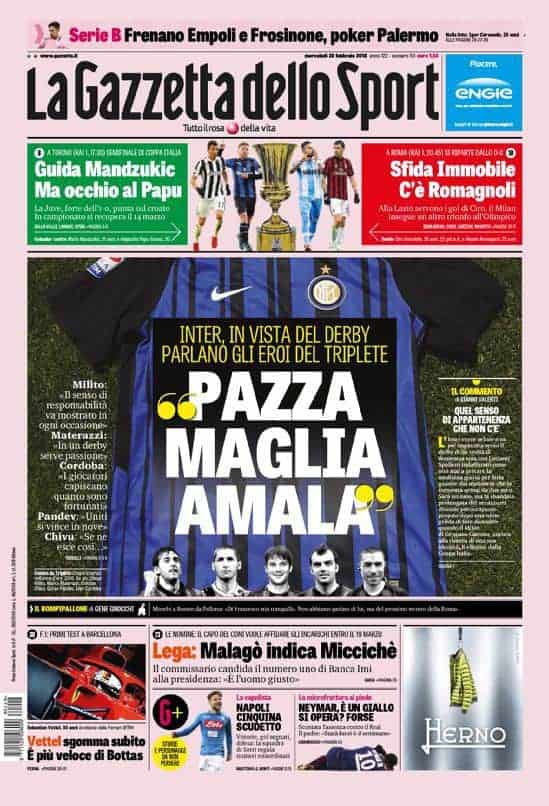 La Gazzetta dello Sport – Primo piano dedicato al derby tra Milan e Inter, con una grande maglia nerazzurra con scritto “Pazza maglia amala”: a proposito di questo, hanno rilasciato delle parole alcuni eroi del Triplete come Milito, Materazzi, Cordoba, Pandev e Chivu. Taglio alto dedicato ai due match di Coppa Italia di stasera: Lazio-Milan e Juventus-Atalanta. Ieri, si è giocata anche la Serie B: poker del Palermo, pareggi di Frosinone ed Empoli. Taglio basso, infine, per la Formula 1 e per la Lega Serie A: Malagò ha indicato Miccichè come Presidente della FIGC. Intanto, il Napoli registra numeri da scudetto, mentre Neymar è un caso: potrebbe operarsi e star fuori 6-8 settimane.