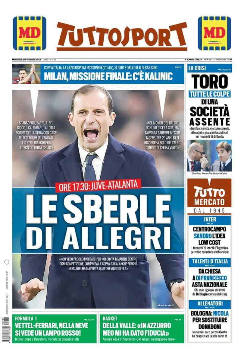 Le prime pagine dei principali quotidiani sportivi di mercoledì 28 febbraio 2018: in primo piano Juventus-Atalanta e Lazio-Milan di Coppa Italia. E domenica il derby di Milano