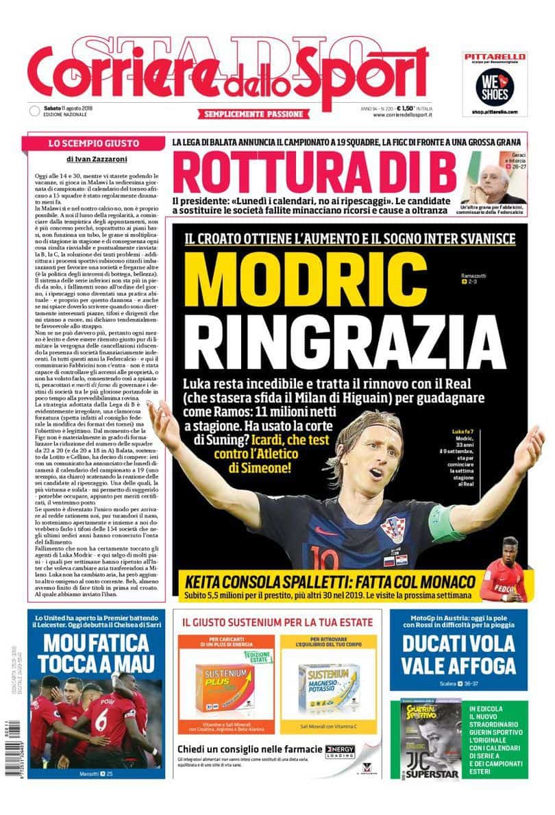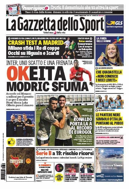A sei giorni dalla fine del calciomercato, c’è sempre l’Inter a occupare le prime pagine dei principali quotidiani sportivi. I nerazzurri hanno chiuso l’accordo con il Monaco per il trasferimento di Keita, ma stanno vedendo sfumare il sogno Modric, a cui Florentino Perez pare abbia offerto un rinnovo a 11 milioni annui. La squadra di Spalletti, intanto, oggi è a Madrid per l’amichevole con l’Atletico e Ausilio, arrivato anche lui in Spagna, potrebbe fare l’ultimo tentativo. Amichevole di lusso anche per il Milan che affronterà il Real Madrid in una sfida d’altri tempi. I rossoneri nel frattempo provano a chiudere il colpo Bakayoko in prestito dal Chelsea.