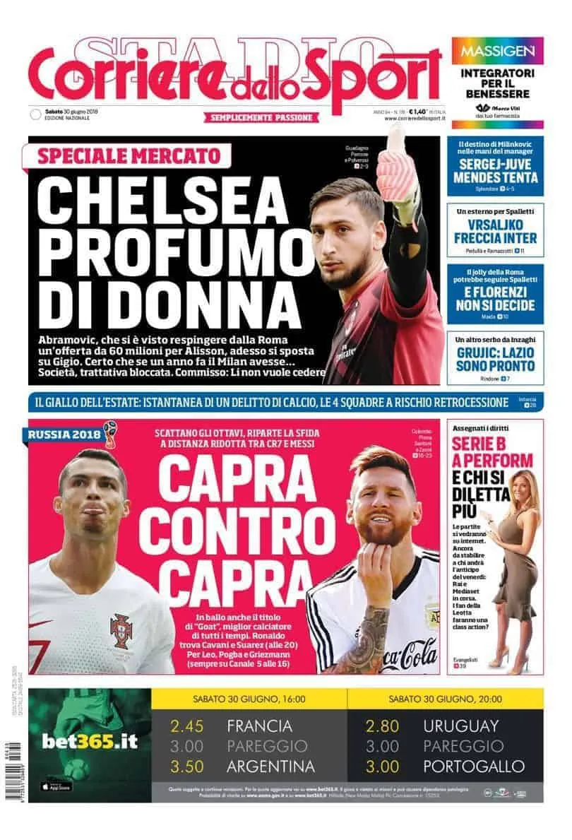 Nei quotidiani odierni spazio ai mondiali di Russia 2018 con la sfida a distanza tra Messi e Ronaldo. Tanto mercato con le mosse di Inter e Juventus