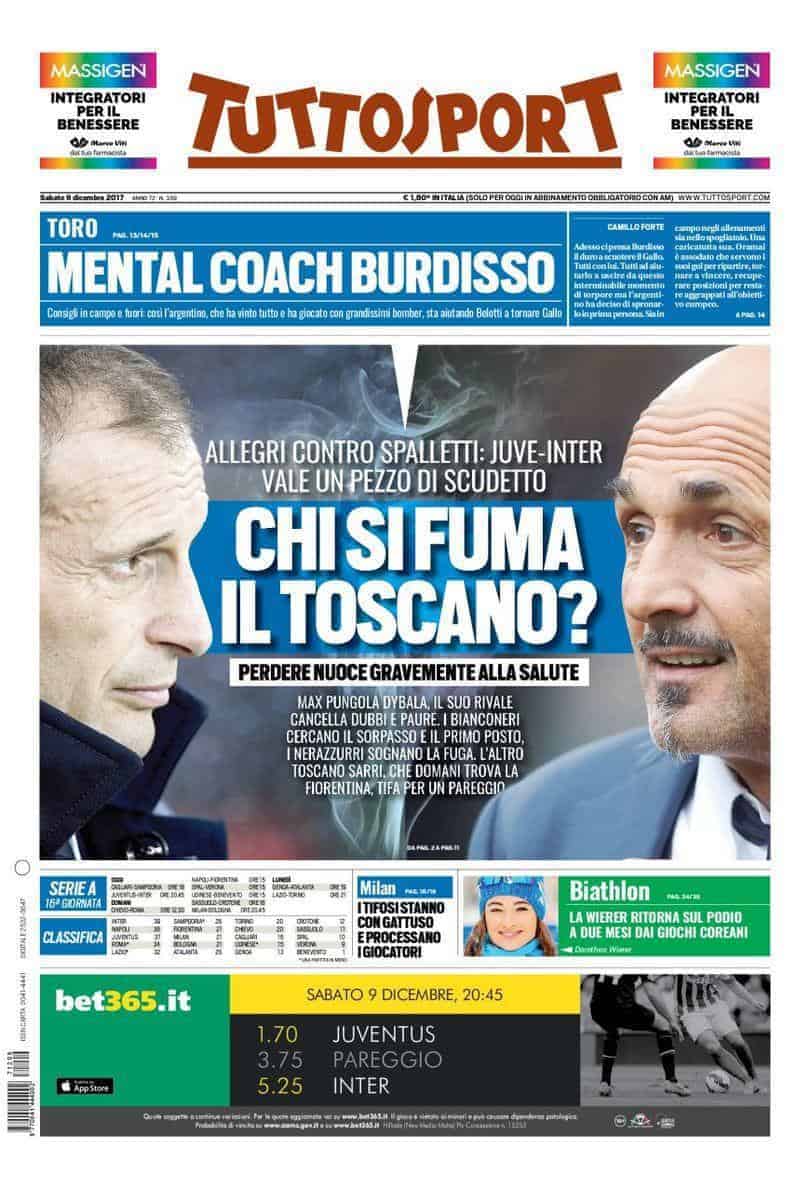 Prime pagine dedicate soprattutto al big match della 16^ giornata di Serie A, Juventus-Inter, che potrebbe significare tanto in ottica scudetto. Passaggio sulle nuove idee tattiche di Gattuso per il Milan e sulla presentazione di Zenga come nuovo allenatore del Crotone. Intanto il Bologna cerca il record a San Siro.