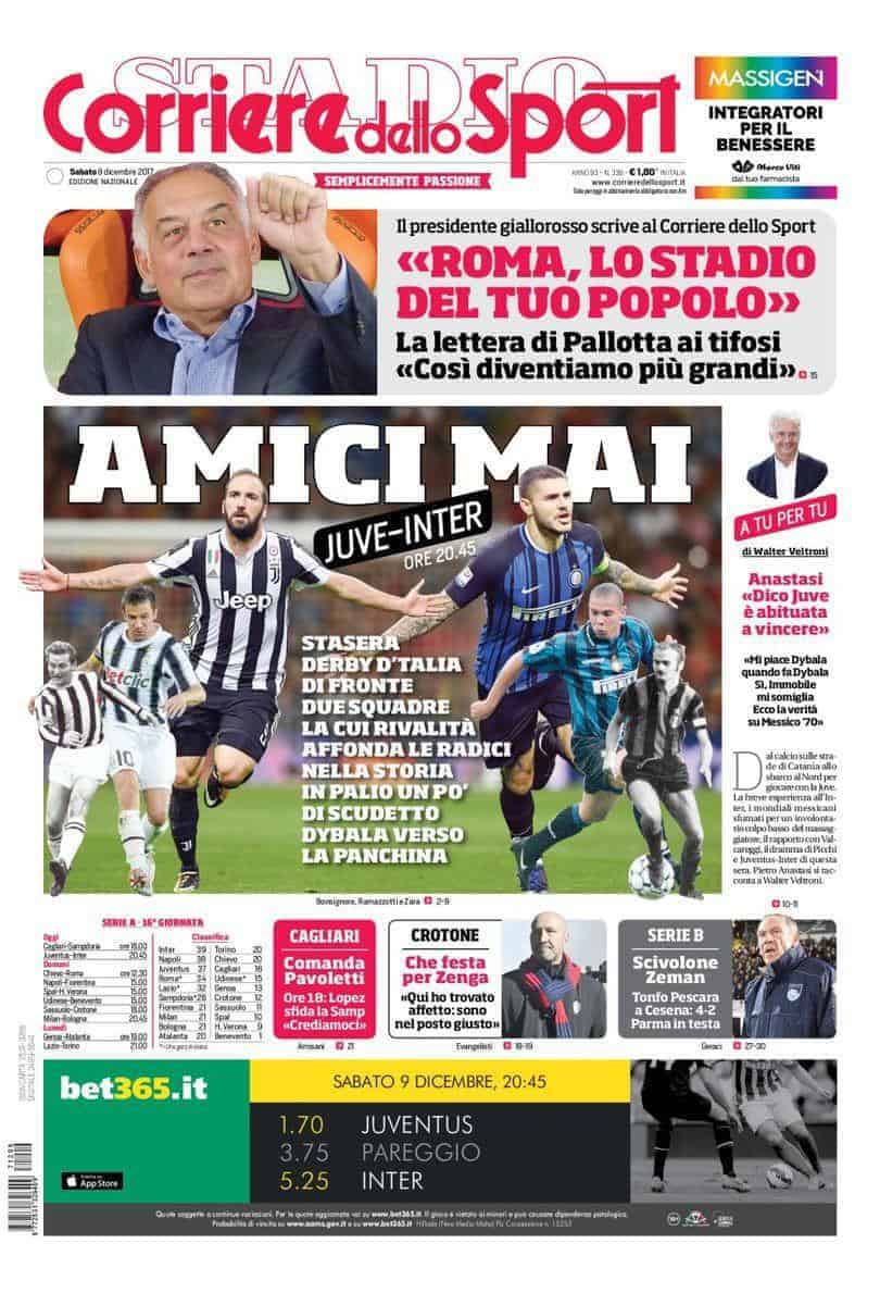 Prima pagina Corriere dello Sport – Tema principale Juventus-Inter con Dybala che potrebbe andare clamorosamente in panchina come fatto intuire in . Taglio alto dedicato alla lettera di Pallotta ai tifosi che definisce il nuovo impianto come lo “stadio del popolo“. In basso titoletti dedicati all’altro anticipo del sabato tra Cagliari e Sampdoria, alla presentazione di Zenga come nuovo tecnico del Crotone e alle partite del venerdì in Serie B.