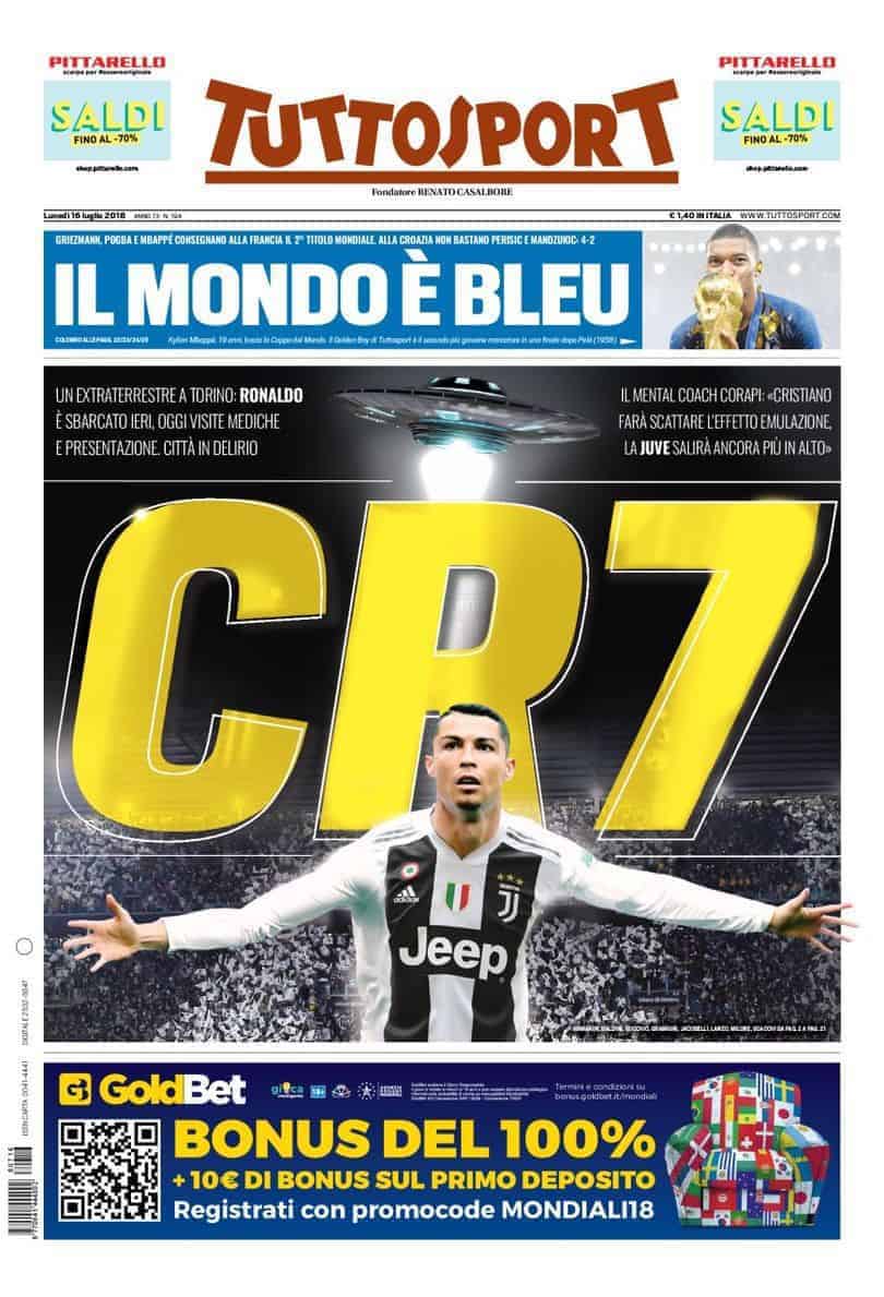 I principali quotidiani sportivi oggi celebrano il trionfo della Francia a Russia 2018. Ampio spazio anche a Cristiano Ronaldo che ieri è atterrato a Torino