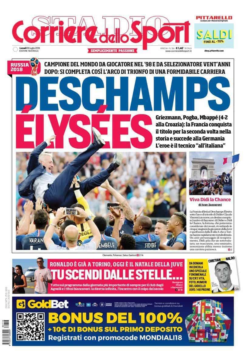 All’indomani delle finalissima di Russia 2018 Francia-Croazia, i principali quotidiani sportivi non potevano non celebrare il trionfo dei transalpini. La rosea apre con un “A l’italienne“, facendo riferimento al calcio fato di contropiede di Deschamps. D’accodo su questa linea anche il “Corriere dello Sport” che apre con un “Deschamps Élysées“, celebrando i francesi ed esaltando il loro ct “all’italiana”, l’unico, insieme a Zagallo e Beckembauer, a vincere la prestigiosa coppa sia da allenatore che da giocatore. “Tuttosport” non dedica la prima pagina all’impresa transalpina, ma solo un trafiletto.