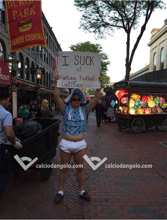 Il malcapitato fantallenatore della Major League Soccer statunitense è stato costretto a girare per le strade in “abbigliamento” da neonato e con un cartello laconico: “Faccio schifo al fantacalcio“. Non manca un hashtag altrettanto eloquente: #LastPlastPunishment, penitenza per l’ultimo posto.